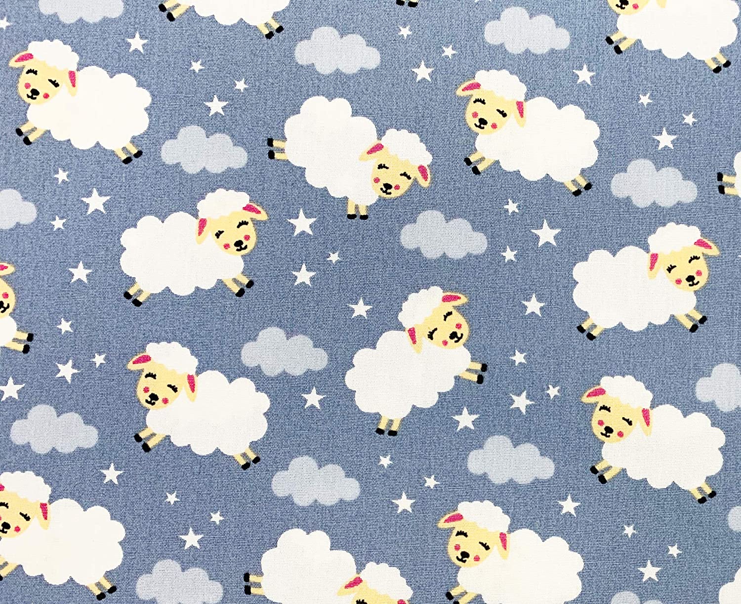 1 Metre Childrens Sleepy Sheep with stars on Grey 100% Cotton Fabric 43 Width