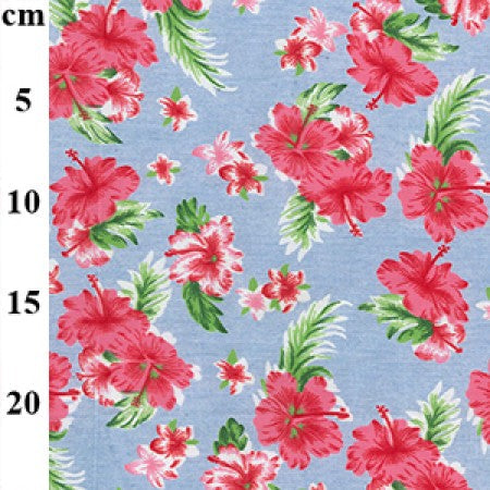 1metre Pink Hibiscus Light Denim 100% Cotton Fabric x 147cm